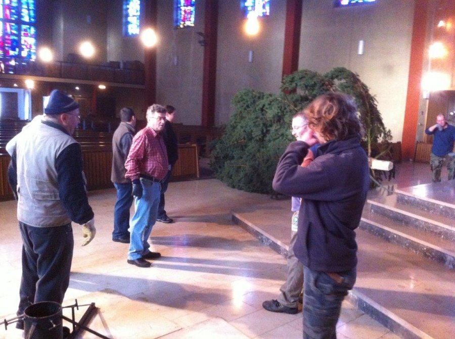 Nur mit vereinten Kräften gelang es, den gewaltigen Weihnachtsbaum 2015