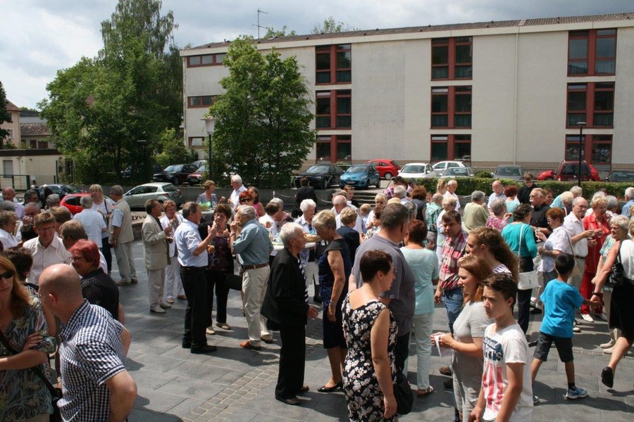 Zahlreiche Gottesdienstbesucher, die auf dem Vorplatz persönlich Abschied nehmen