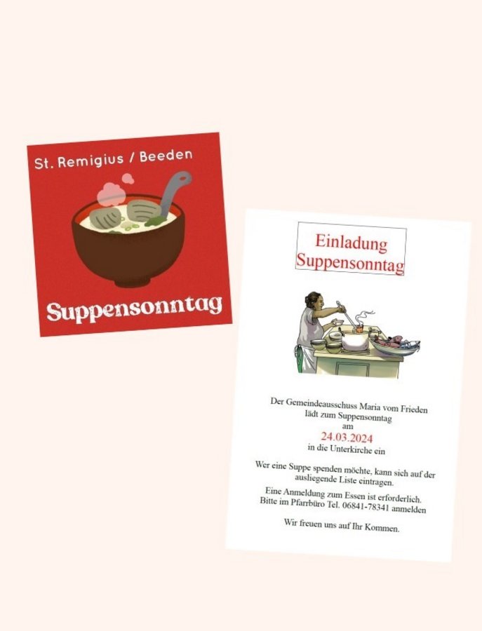 Der Gemeindeausschuss Maria vom Frieden lädt zum Suppensonntag am 24. März 2024 im Anschluss an den Sonntagsgottesdienst, den wir um 11.00 Uhr in der Kirche feiern, in die Unterkirche ein.