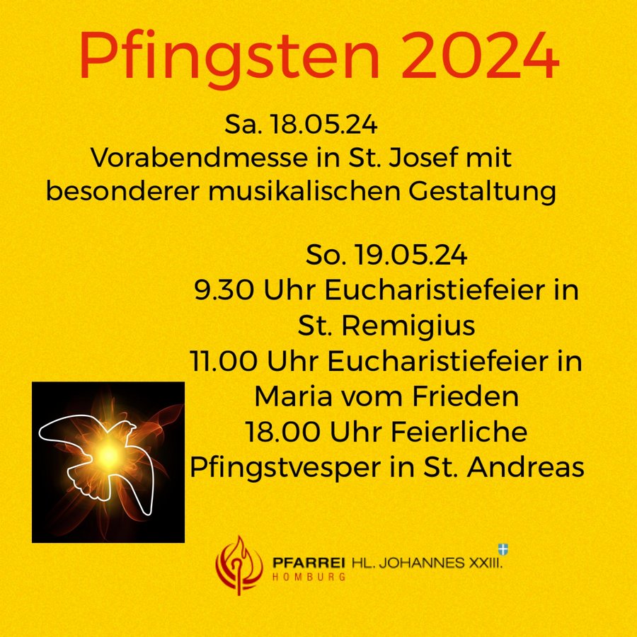 Samstag, 18. Mai 18.00 Uhr St. Josef Jägersburg: Vorabendmesse zu Pfingsten mit besonderer musikalischer Gestaltung
