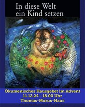 Wir laden herzlich ein zum ökumenischen Hausgebet im Advent am Mittwoch, den 11. Dezember 2024 um 18.00 Uhr im Thomas-Morus-Haus. Der Gottesdienst wird musikalisch mitgestaltet von der Gruppe „Atemwind“.