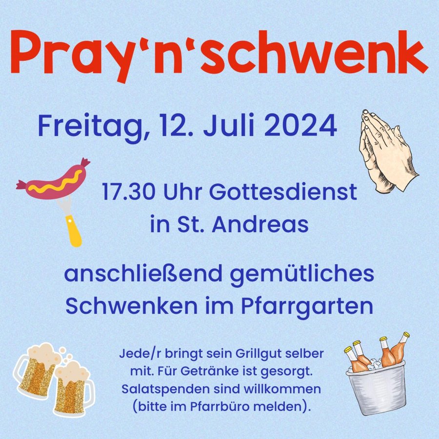 Am Freitag, den 12. Juli findet wieder die Veranstaltung „Pray'n'schwenk“ statt. Beginn ist um 17.30 Uhr mit einem Gottesdienst in der St. Andreaskirche, anschließend gemütliches Schwenken im Pfarrgarten. Bitte bringt Euer/ bringen Sie Ihr Grillgut mit. Für Getränke ist gesorgt. Wer ein Salat spenden möchte, bitte im Pfarrbüro melden. Herzliche Einladung an alle.