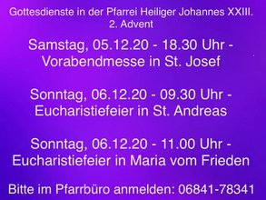 Bitte melden Sie sich bis Freitag 04. Dezember 11.00 Uhr im Pfarrbüro an unter Tel. 06841-78341.