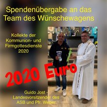 Im Rahmen des Dankgottesdienstes der Firmlinge am 02.07.2021 wurde dem Landesvorsitzenden Guido Jost des ASB eine Spende in Höhe von 2020 € für die Aktion „Wünschewagen“ übergeben. Die Spendensumme wurde bei den Kommunion- und Firmgottesdiensten 2020 gesammelt.