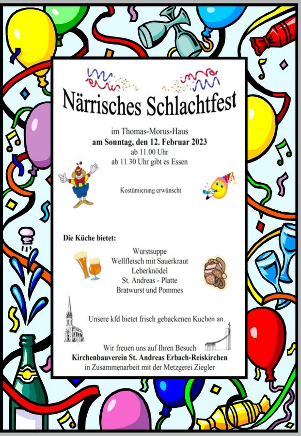 Am Sonntag, den 12. Februar 2023 lädt der Kirchenbauverein St. Andreas Erbach-Reiskirchen ab 11.00 Uhr wieder zum närrischen Schlachfest ins Thomas-Morus-Haus ein.