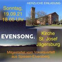 Der Evensong, ein abendliches Stundengebet, ist ursprünglich in der anglikanischen Kirche beheimatet. Inzwischen ist er auch in der evangelischen und der katholischen Kirche verbreitet. Wichtigstes Element ist der gemeinsame Psalmengesang, weitere Bestandteile sind Chorlieder, Gemeindelieder sowie zwei Lobgesänge aus dem Neuen Testament, das Magnificat (Lobgesang Mariens) und das Nunc Dimittis (Lied des greisen Simeon). Eine Lesung, Fürbitten und Momente der Stille gehören ebenfalls dazu und laden zur Besinnung und Meditation ein.