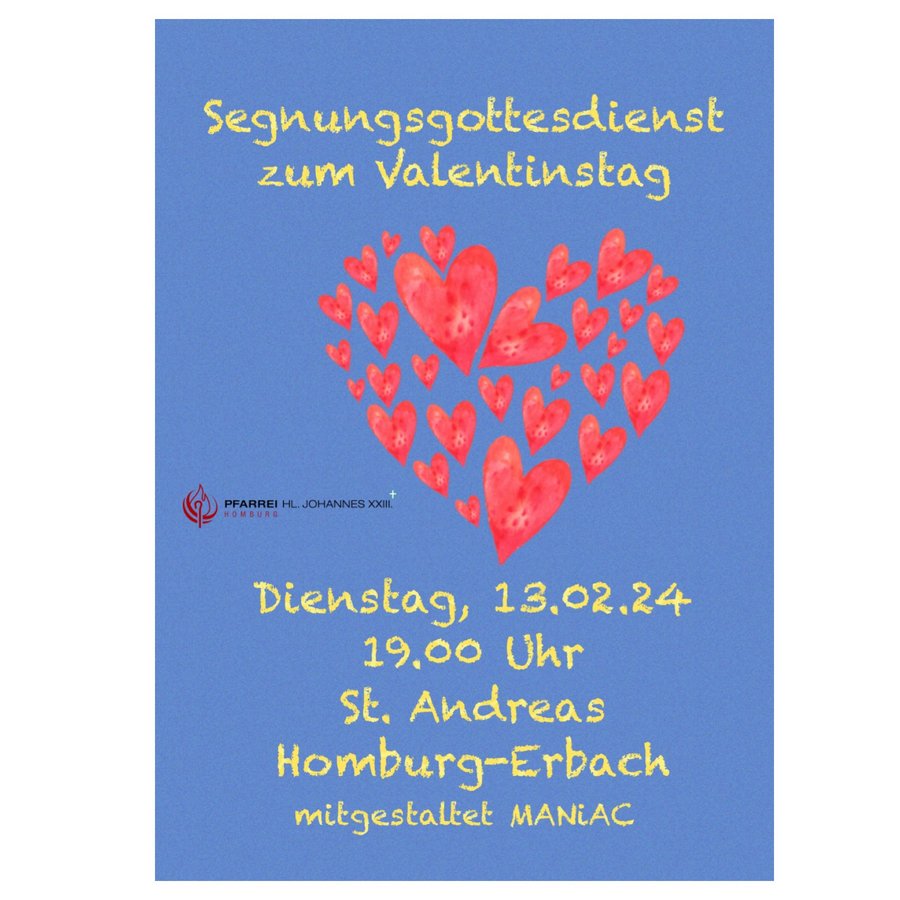 Am „Vorabend“, dem 13. Februar 2024, gibt es dazu in Homburg-Erbach Gelegenheit. Um 19.00 Uhr findet in der St. Andreas-Kirche ein Segnungsgottesdienst zum Valentinstag statt.